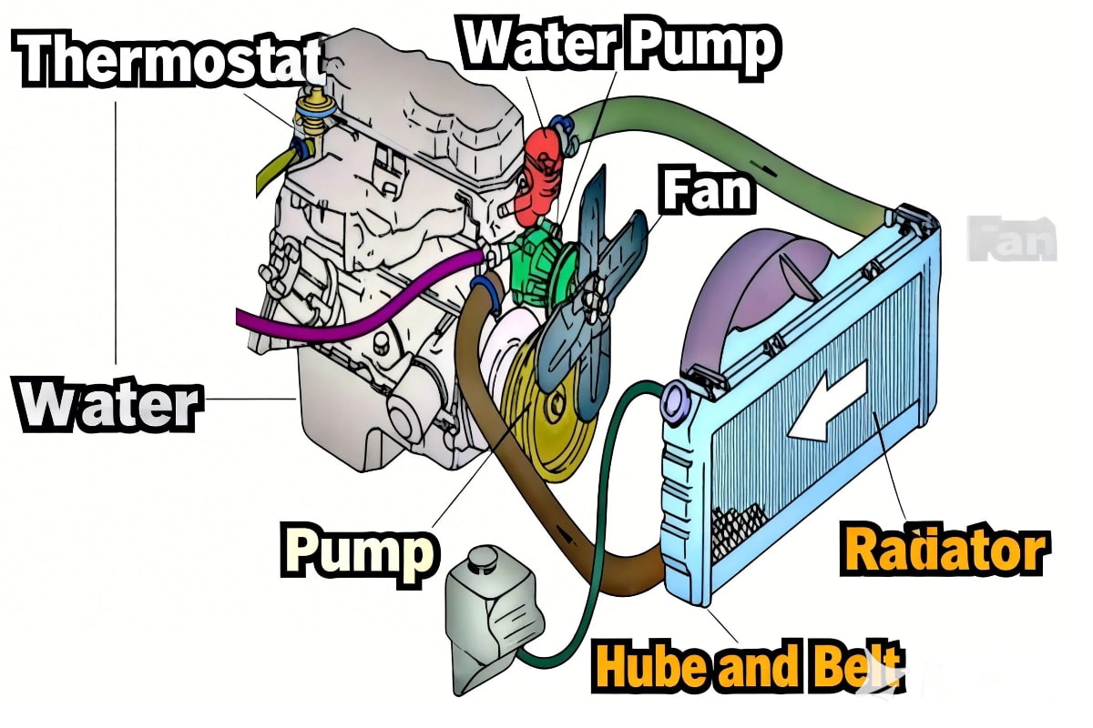 (1) Composants du système de refroidissement : Le thermostat contrôle le circuit de circulation du liquide de refroidissement (petit circuit pour un réchauffement rapide, grand circuit pour une meilleure dissipation de la chaleur) ; la pompe à eau, le radiateur et le ventilateur assurent l'efficacité du flux de liquide de refroidissement et la capacité de dissipation de la chaleur.